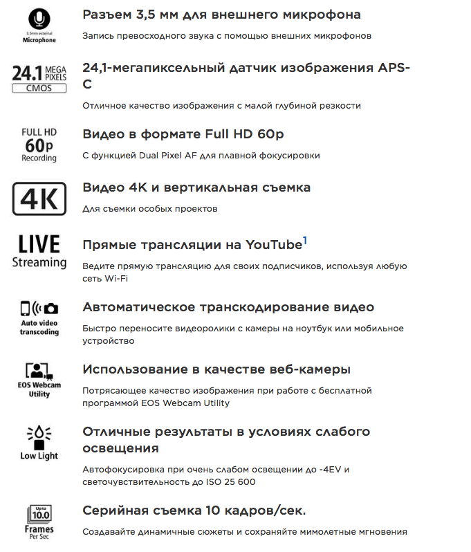 - процессор обработки изображения digic 8; вес (с картой памяти и аккумулятором) 387 г (черный), 388 г (белый); поддерживает сменные объективы ef/ef-s с адаптером; условия эксплуатации 0–40 °c, при влажности 85% и менее