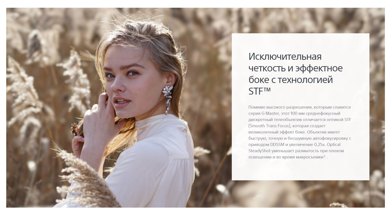 Особенности конструкции Объектив выполнен в стиле современных камер серии Alpha, оснащен сверхбыстро фокусирующимся мотором линейного типа Direct Drive Super Sonic Wave Motor (DDSSM). Система плавного перехода диафрагмы позволяет создать удивительно мягкую боковую зону размытия, придавая изображениям особую художественность и воздушность.