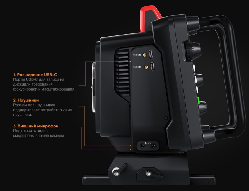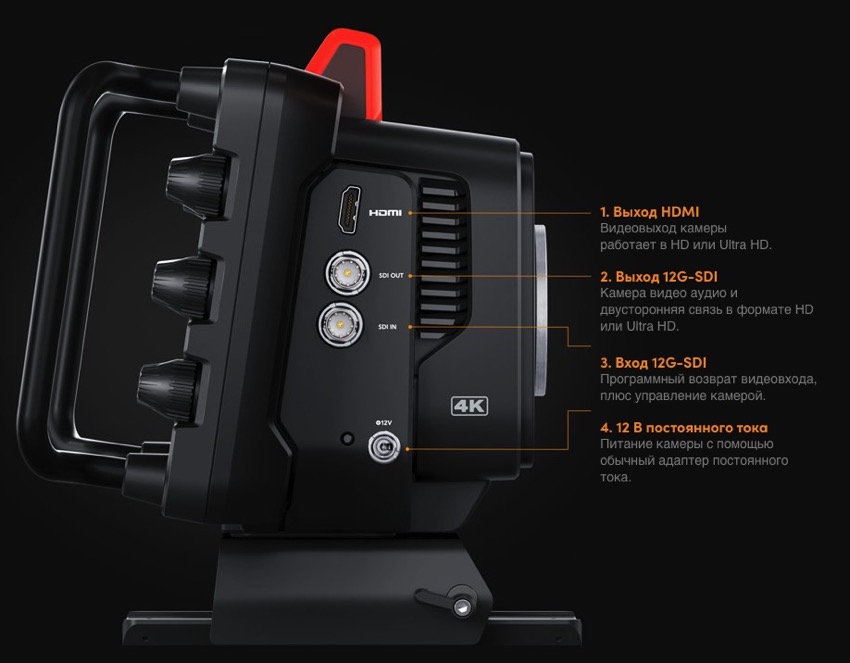 Идеальная мини-студийная камера оснащена кинематографическим сенсором 4K с чувствительностью до 25 600 единиц ISO, креплением объектива MFT, разъемами 12G-SDI и HDMI, разъемом двусторонней связи 3,5 мм, 7-дюймовым ЖК-экраном с солнцезащитной блендой, корректором цвета и возможностью записи на USB-диски.