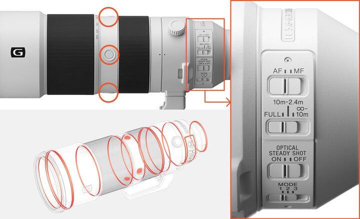 Внутренний механизм масштабирования поддерживает постоянное фокусное расстояние объектива во время съемки с рук. Настраиваемые кнопки удержания фокусировки, расположенные в трех разных частях корпуса под углом 90°, обеспечивают удобный доступ при съемке с любой ориентацией. Фтористое покрытие фронтального элемента и пылевлагозащищенный корпус обеспечивают надежную работу в сложных условиях.