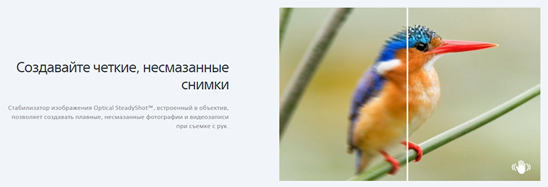 Стабилизатор изображения Optical SteadyShot™, встроенный в объектив, позволяет создавать плавные, несмазанные фотографии и видеозаписи при съемке с рук.