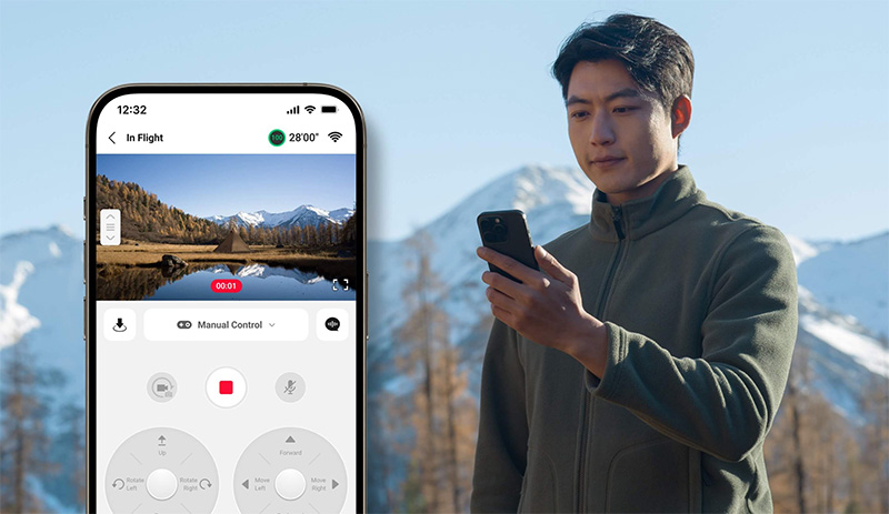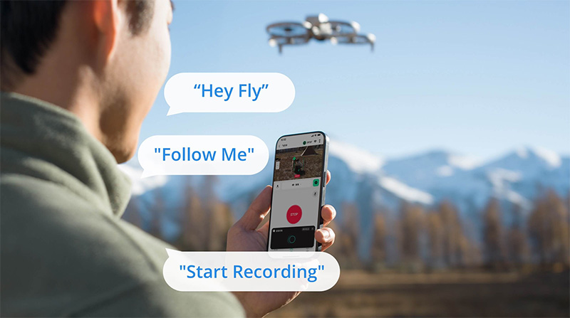 Фраза "Hey Fly" активирует голосовое управление в приложении DJI Fly. Дрон, подключённый к вашему смартфону, может записывать звук, автоматически удаляя шум от пропеллеров.